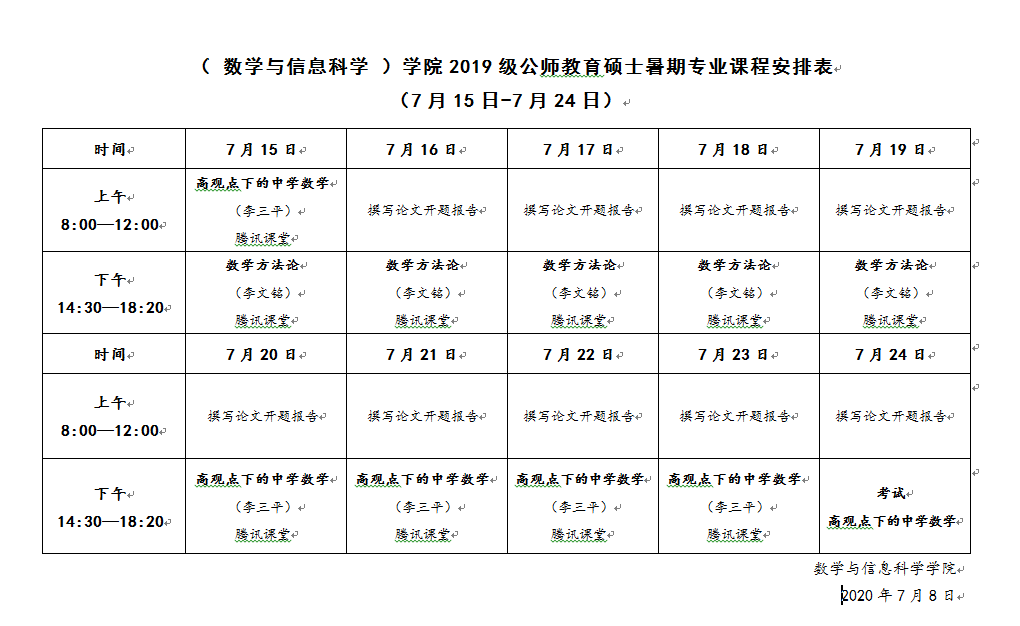 数学与信息科学公司2019级公师教育硕士暑期专业课程安排表