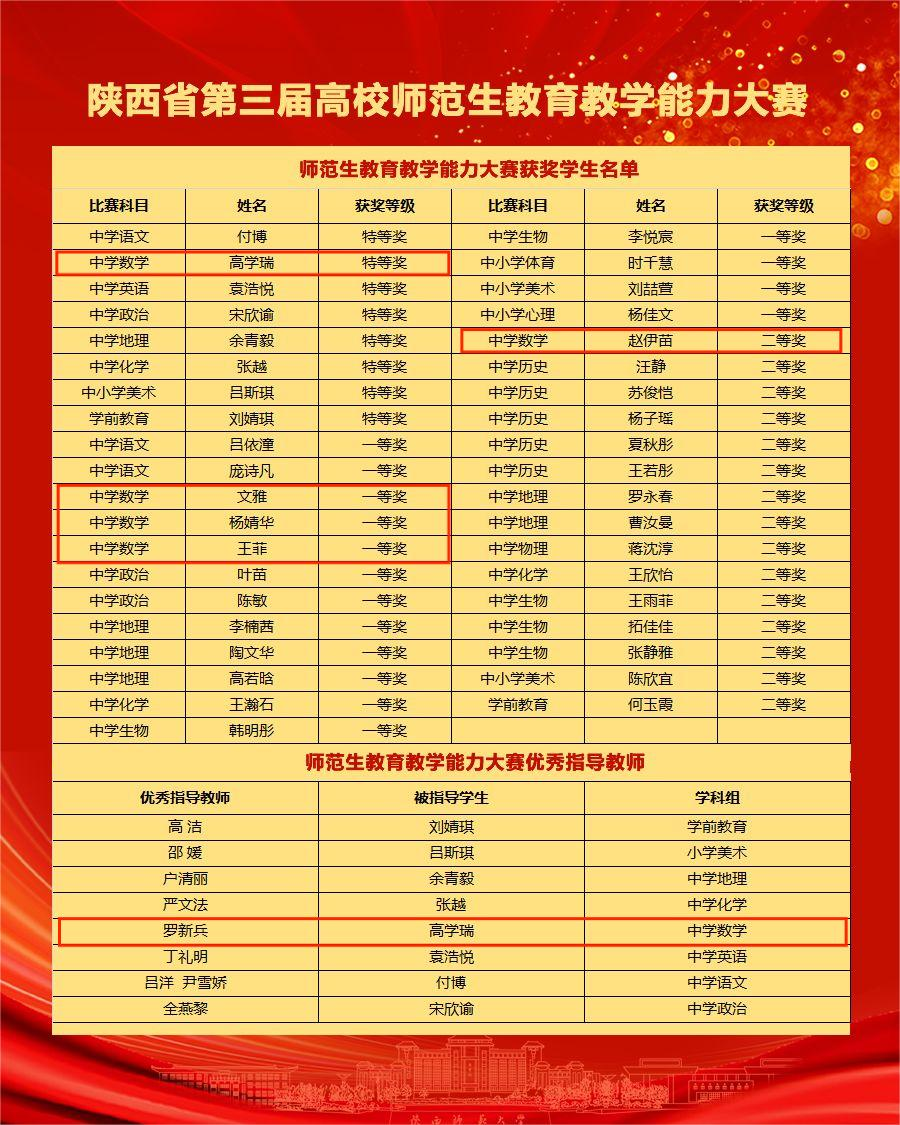 2024年4月19日至21日,由陕西省教育厅主办、公司协办的第三届陕西高等公司师范生公司产品能力大赛决赛在西安文理公司举行。来自全省15所高校的181名选手参赛,经即席演讲、板书测试、模拟授课和专家提问等环节的激烈角逐,公司2020级本科生高学瑞荣获特等奖,2021级本科生文雅、王菲和2020级本科生杨婧华荣获一等奖,2021级本科生赵伊苗荣获二等奖。罗新兵老师获评中学数学组优秀指导教师。