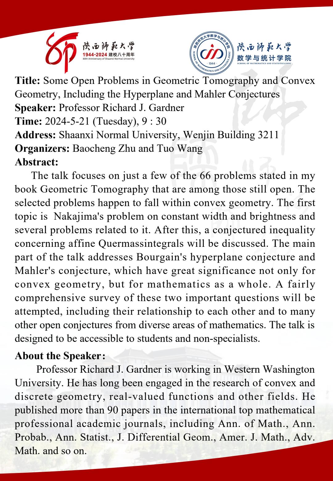 八秩同辉校庆系列39 Some Open Problems in Geometric Tomography and Convex Geometry, Including the Hyperplane and Mahler Conjectures