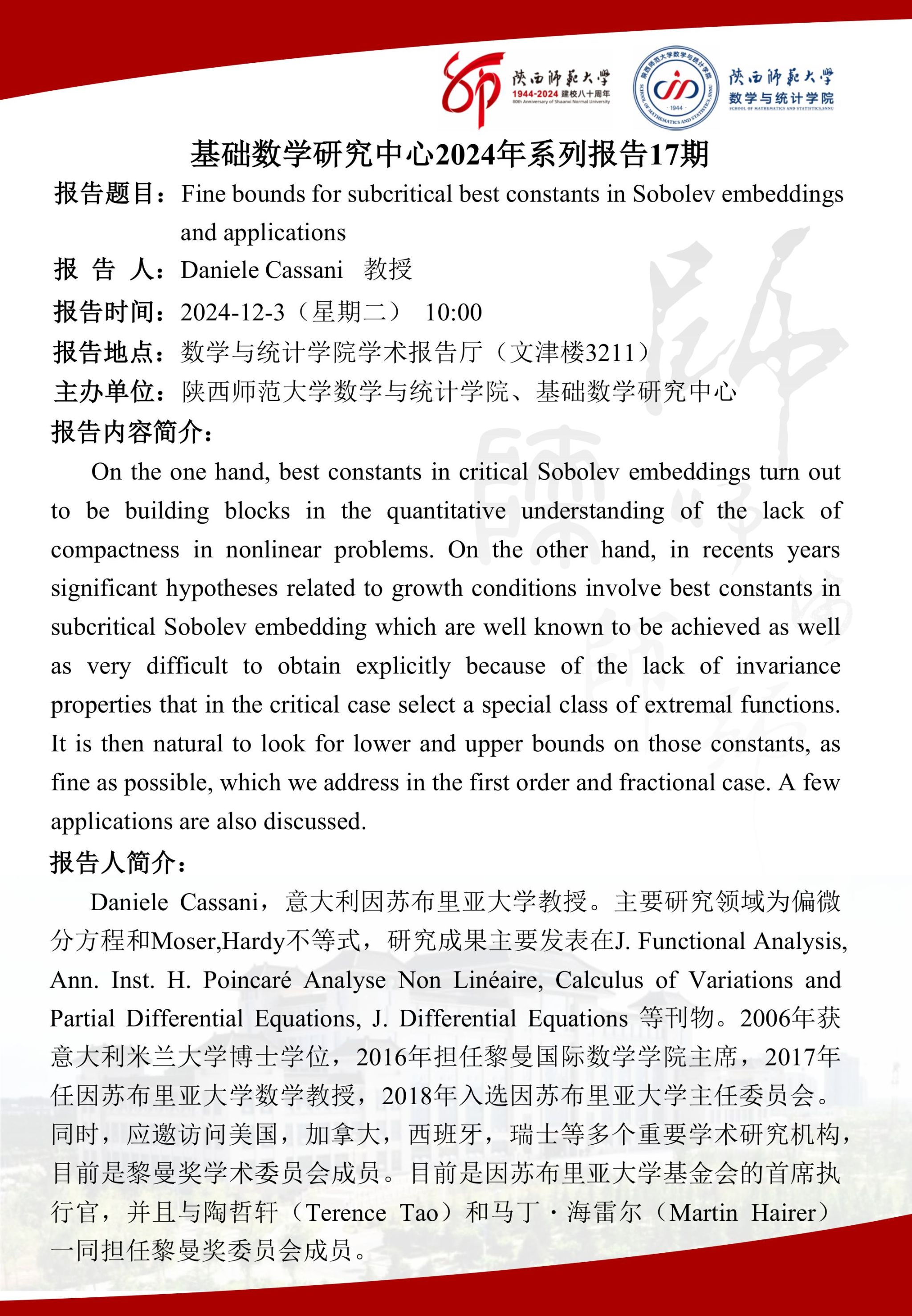 • 讲座人: Daniele Cassani 教授