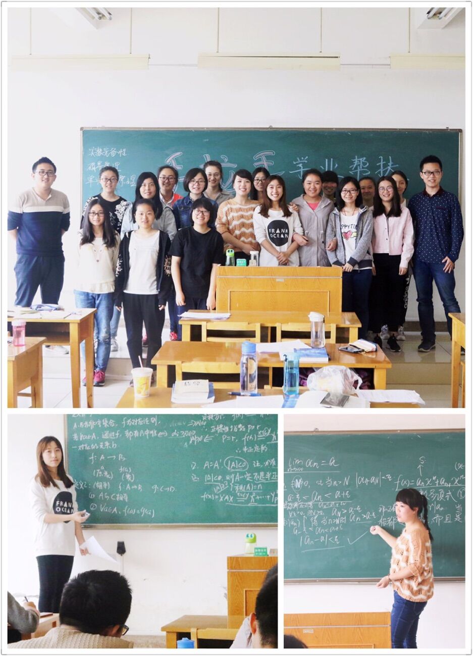 本学期开学后,2015级各班开展了“11”、“1对多”学业帮扶活动,采取自愿原则,由需要帮扶同学和志愿帮扶同学结对子,一起上自习,一起养成良好的良好的学习习惯,一起解决学习上的难题。李芳和秦小雨专业知识比较扎实,她们自发组织了自己的小课堂,为转专业的同学讲解大一的数学分析和高等代数两门课,第7-17周每周六上午在文津楼402教室进行。课后,她们还将重点习题整理成作业分发给同学们,以便于同学们对所学知识进行巩固与提升。