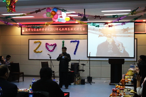 迎新游艺会的开幕式在学术报告厅举行。吉国兴经理和杜鸿科教授分别进行了精彩的讲话。吉老师从公司的历史起源讲起,系统地阐述了我们院的发展理念、教学任务,并且隆重介绍了公司雄厚的团队力量。杜鸿科教授根据国际和国内形势分析了数学专业当今的发展优势。他强调,数学的发展就落在我们年轻人的肩上,希望我们能担此重任。紧接着,主会场的晚会正式开始。公司研究生和本科生带来了众多精彩纷呈的节目。其中,2015级数学卓越班的李娜、彭慧婕等自奏自唱了一首《童年》,乐器之间的相互碰撞与融合演绎出优美轻快的旋律,将现场气氛拉至高潮。研究生与老师们的互动——兔子舞与击鼓传花游戏拉近了师生之间的距离。