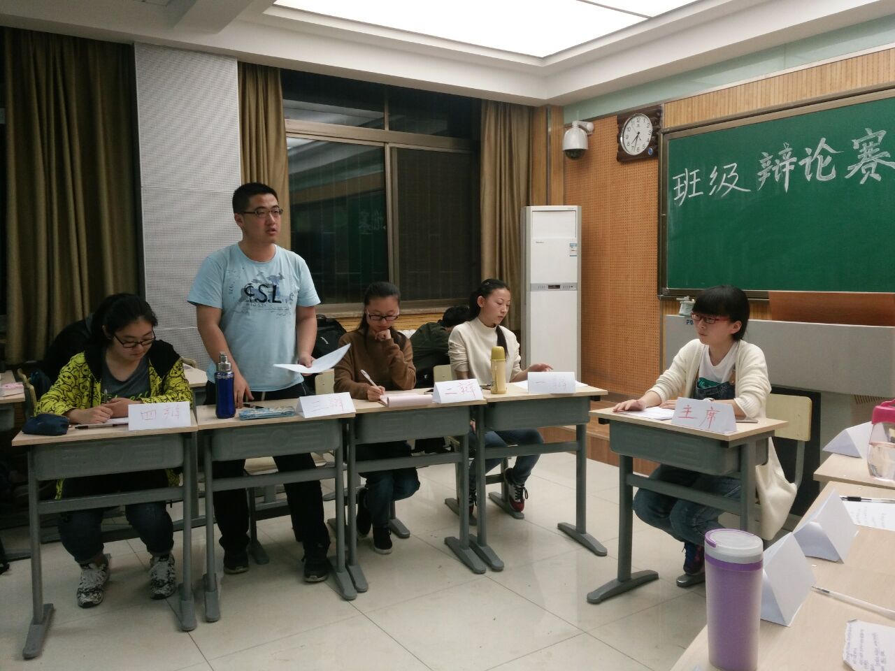 第二环节为辩论环节。双方一辩陈词,接着二三辩进行攻受之战。一辩总结后,进入最为激动人心的自由辩论环节,唇枪舌战,口若悬河,是非曲直在他们的辩论下变得轮廓分明。反方从古至今,跨越国界的论证十分精彩。观众提问环节,陈楚皓同学向反方质疑,妙语连珠,尤为精彩,引得掌声一片。正方四辩黄雪晴的华丽总结又为正方驳回一筹。整个过程扣人心弦。第三环节是评委点评以及评分。杨伟民和齐媛媛点评犀利,十分到位,全场的气氛充分得到了调动。根据评委评分,主席宣布反方胜利,并根据辩论赛中选手及观众的表现,选拔出了优秀选手作为班级代表参加年级辩论赛。