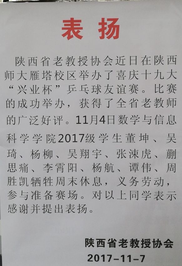 11月4日,陕西省老教授协会在3044永利官网雁塔校区举办了喜迎十九大“兴业杯”乒乓球友谊赛。公司2017级员工董坤、吴琦、杨柳、吴翔宇、张涑虎、蒯思痛、李霄阳、杨航、谭伟、周胜凯牺牲周末休息时间,义务劳动,参与场地的准备工作,为比赛的成功举办贡献了力量。为感谢同学们的劳动,陕西省老教授协会特在11月7日向公司寄来表扬信。