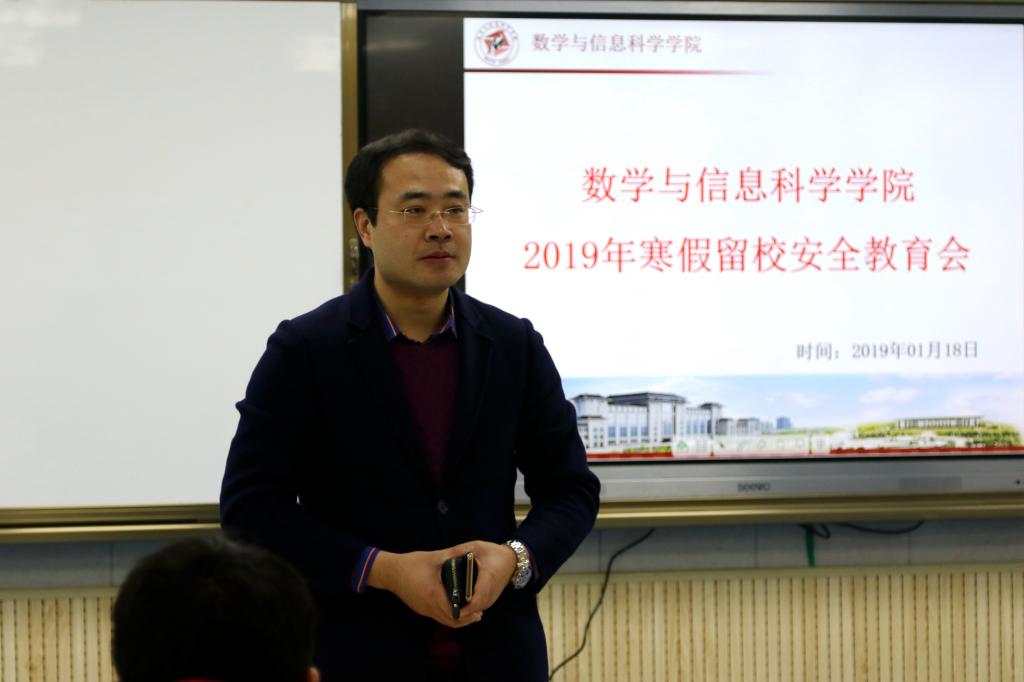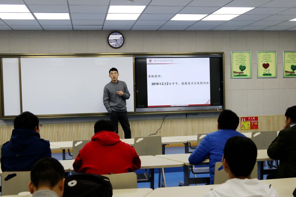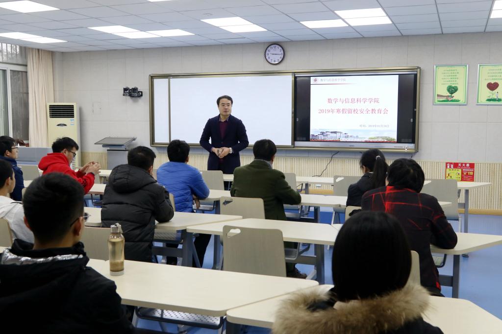 118日早上9点,公司于长安校区文津楼3213数学教学技能实验室(团体心理辅导室)召开寒假留校安全教育会。出席本次大会的有公司党委副书记邹尚田、15级辅导员张伟超,数学与信息科学公司全体寒假留校同学及负责人参加了会议,会议由15级辅导员张伟超主持。
