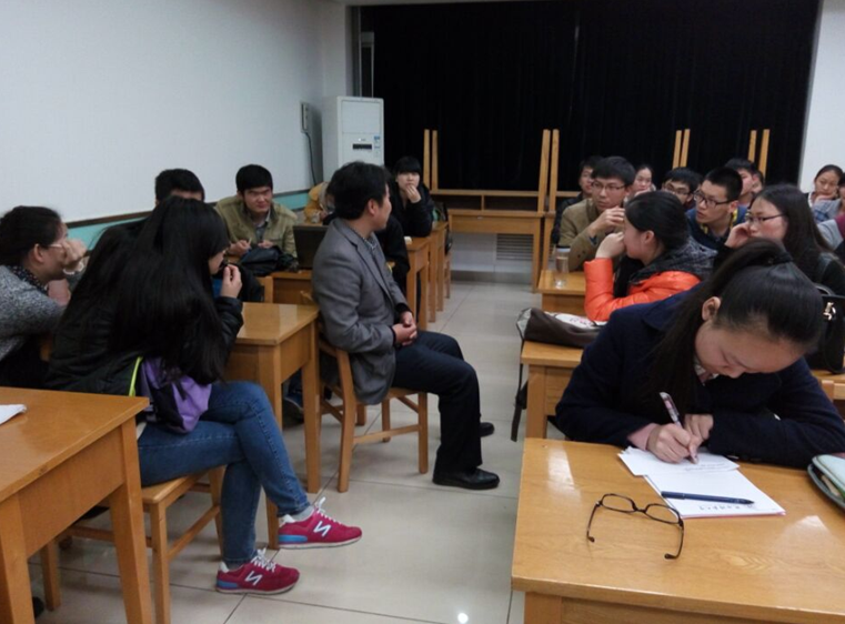 (谈荣江)2015年3月18日晚7点,公司本学期第一期教授接待日活动在文津楼513教室举行,公司党委副书记崔创与来自大三、大二的40余名同学共同探讨就业考研问题。
