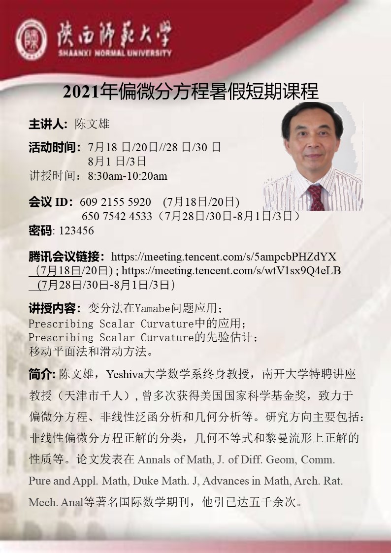 2021年偏微分方程暑假短期课程